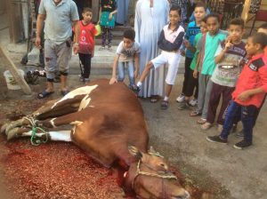 في الساعات الأولى من صبيحة أول أيام العيد ومع أصوات المساجد وتكبيرات العيد يتم البدء لتحضير وتجهيز الأضاحي والتي غالباً ما تكون من “العجول وقليلاً من الخراف ” حيث يتم تجهيز السلخانة أو ما يسمى في مجتمعنا الغزي” مسلخ\ مذبح” أو بشكل أبرز في الشوارع العامة أمام منازل أصحاب الأضاحي حيث تكون طريقة الذبح وفق الطريقة الإسلامية التي يتم فيها قطع الشريانين الرئيسيين في الرقبة دون قطع الرأس كاملاً، وذلك لضمان خروج الدم دفعة واحدة، وبكمية أكبر،لتصبح جاهزة للسلخ والتقطيع والتوزيع على الأقارب والأصدقاء والجيران ويكون ذلك بحضور عدد كبير من أهالي الحي من بينهم أطفال مما قد يتسبب في أذى نفسي للأطفال أو خوف من منظر الدماء على الرغم من فرحتهم العارمة وهم يشاهدون هذه الطقوس ولاسيما لو كانت لأول مرة , أو صاحبها عملية هروب للذبيحة قبيل البدء بذبحها.