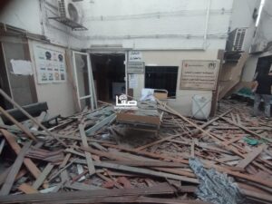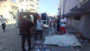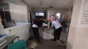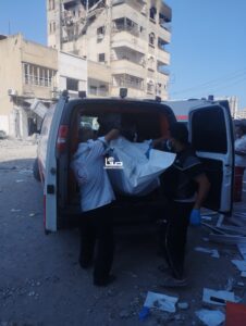 الطوقم الطبية تنتشل عدداً من الشهداء من مستشفى أصدقاء المريض بحي الرمال في مدينة غزة عقب انسحاب جيش الاحتلال