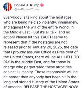 وقال ترامب في منشور عبر وسائل التواصل الاجتماعي، اليوم الاثنين: “إذا لم يتم إطلاق سراح الرهائن قبل 20 يناير 2025، وهو التاريخ الذي أتولى فيه بفخر منصب رئيس الولايات المتحدة، فسيكون هناك ثمن باهظ في الشرق الأوسط. سيدفع المسؤولون عن هذه الفظائع ضد الإنسانية الثمن الأكبر في التاريخ الطويل والحافل للولايات المتحدة الأميركية. أطلقوا سراح الرهائن الآن!”