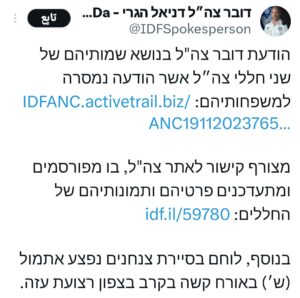 ونشر الجيش الإسرائيلي اسمي الجنديين، مشيرًا إلى أنهما قُتلا خلال معارك وقعت شمال قطاع غزة.