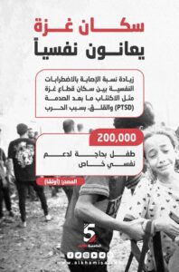 زيادة نسبة الاصابة بالاضطرابات النفسية بين سكان قطاع غزة مثل الاكتئاب ما بعد الصدمة والقلق بسبب الحرب.