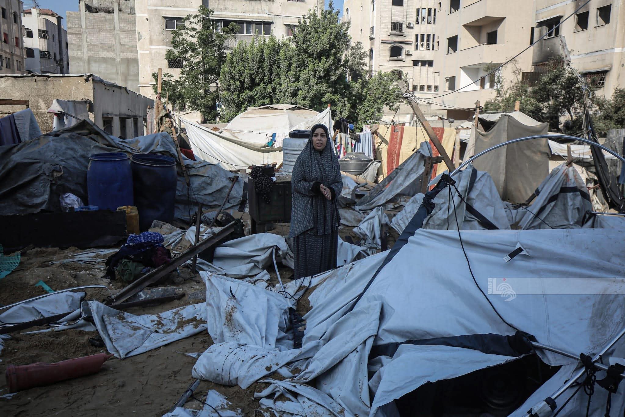 #صور: مواطنون يتفقدون الدمار الذي أصاب خيام النازحين بعد غارة جوية إسرائيلية بالقرب من مدرسة المأمونية.