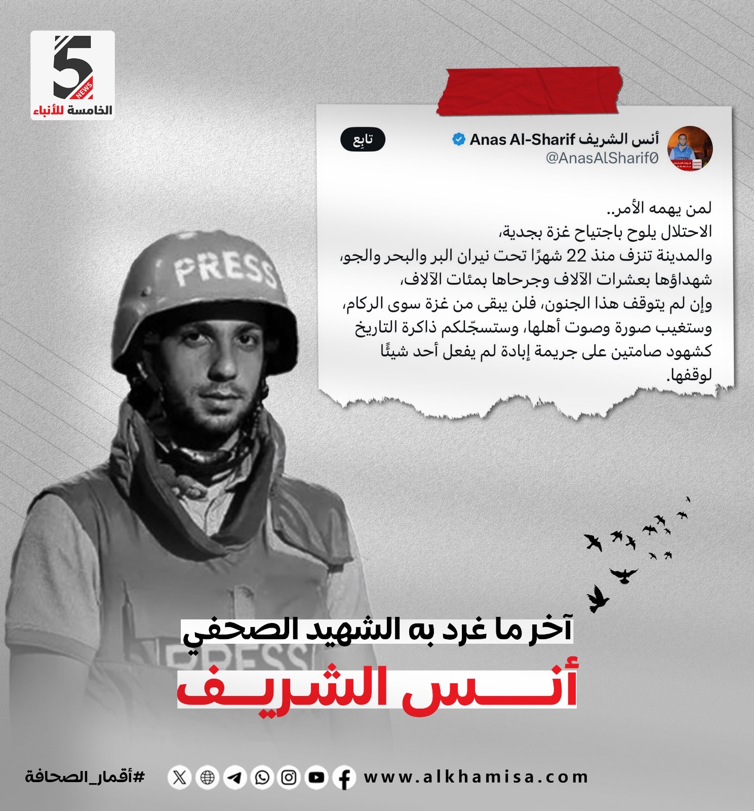 آخر ما غرد به الشهيد الصحفي أنس الشريف الذي اغتاله الاحتلال أثناء تأدية واجبه الصحفي قبالة مستشفى الشفاء بغزة