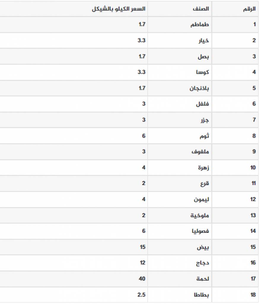 جاءت أسعار الخضروات، والفواكه والدجاج واللحوم في قطاع غزة اليوم الثلاثاء، كما يلي: