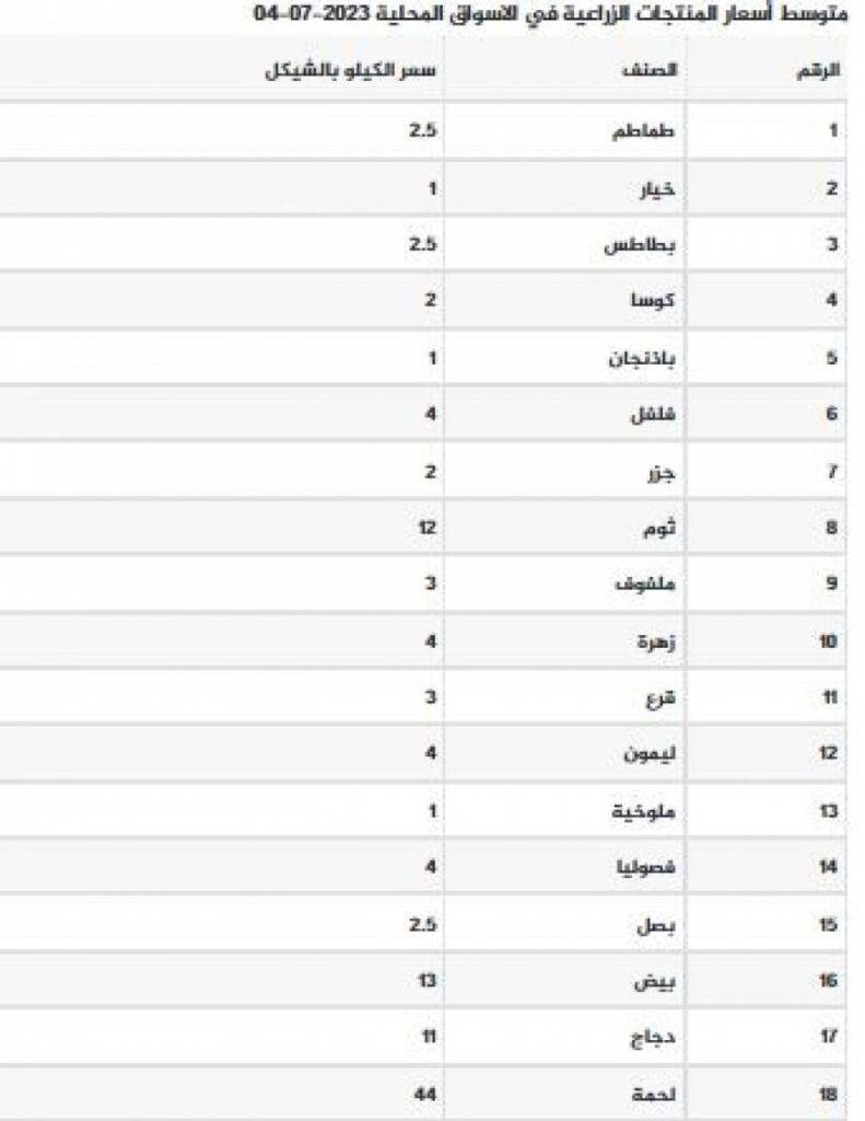 جاءت أسعار الخضروات، والفواكه والدجاج، واللحوم في قطاع غزة، اليوم الثلاثاء، كما يلي.