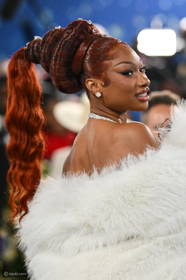 ميغان ذي ستاليون وتألقها بتسريحة ذيل الحصان الأحمر الجريئة والمكياج الترابي