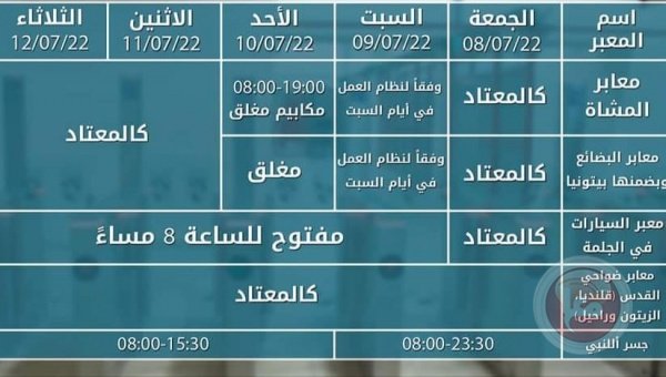 ونشرت المواقع العبرية التفاصيل حول التغييرات على ساعات عمل المعابر خلال فترة عيد الأضحى على النحو التالي: