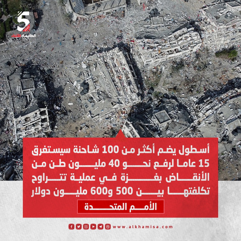 اسطول يضم أكثر من 100 شاحنة سيستغرق نحو 15 عام لرفع 40 مليون طن من الأنقاض بغزة