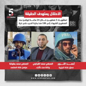 استشهاد 3 صحفيين خلال 24 ساعة ليرتفع عدد الصحفيين الشهداء إلى 196 منذ بداية الحرب على غزة