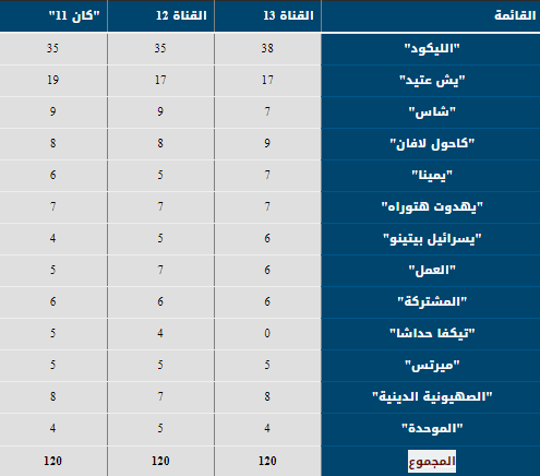 في المقابل، يتراجع تمثيل حزب “شاس” الحريدي، ليحصل على 7 أعضاء كنيست، في حين يرفع حزب “كاحول لافان” تمثيله بمقعد برلماني واحد، ويحصل على 9 مقاعد؛ وتحصل قائمة “يهدوت هتوراه” الحريدية على 7 مقاعد، كما يحصل حزب “يسرائيل بينيتو” على 6 أعضاء كنيست، وكذلك حزب “العمل” والقائمة المشتركة (6).