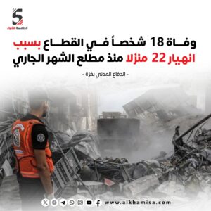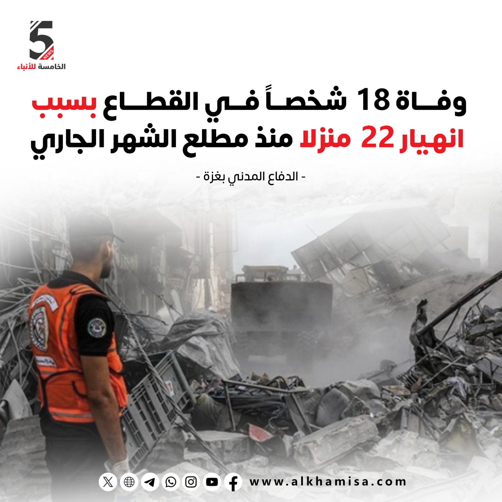 الدفاع المدني: وفاة ١٨ شخص في القطاع بسبب انهيار ٢٢ منزل منذ مطلع الشهر الجاري