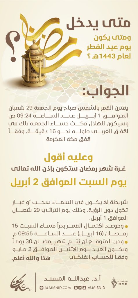 وفي وقت سابق، أعلن أستاذ المناخ، عبد الله المسند، عن موعد غرة شهر رمضان المبارك لعام 2022 (1443 هجري)، وموعد أول أيام عيد الفطر.