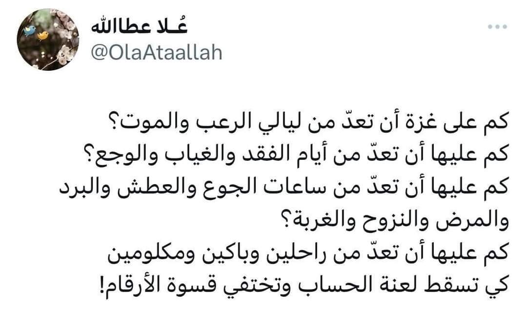 في آخر ما خطّته على منصة “إكس”، كتبت كلمات وكأنها وصية : “كم على غزة أن تعدّ من ليالي الرعب والموت؟ كم عليها أن تعدّ من أيام الفقد والغياب والوجع؟”