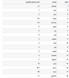 وجاء متوسط الأسعار وفقًا لوزارة الزراعة في قطاع غزة على النحو التالي:
