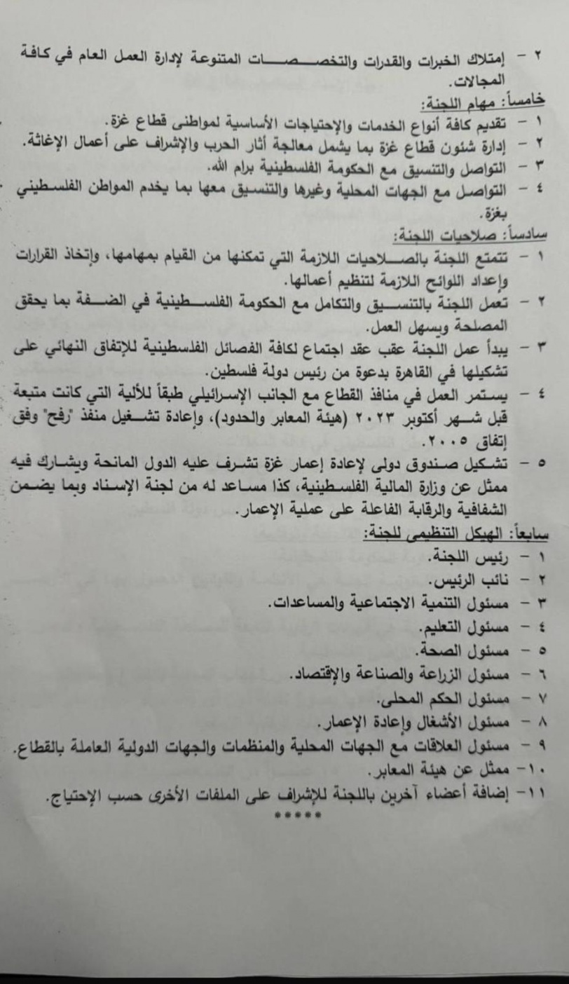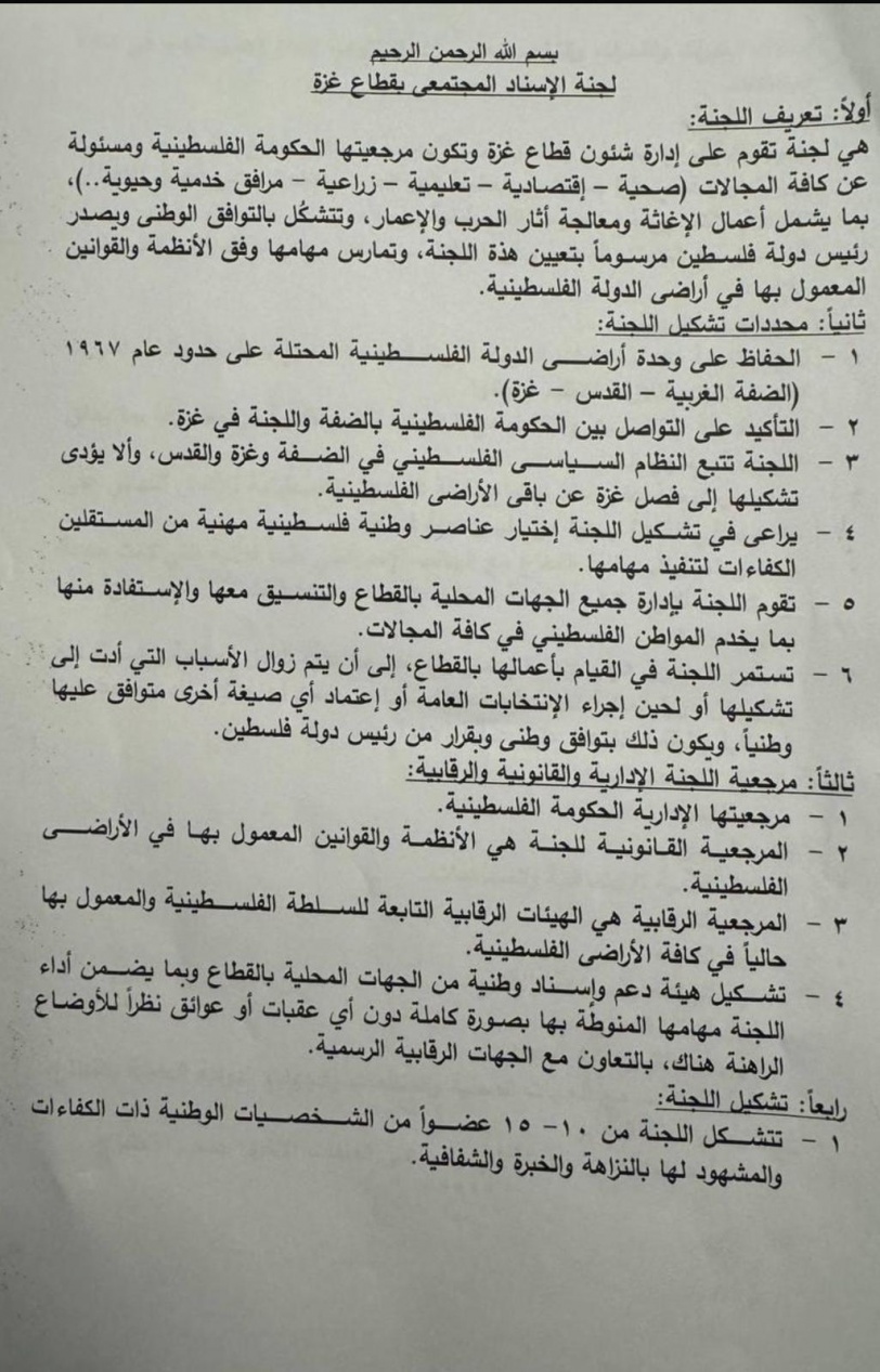 وتظهر وثيقة مسودة الاتفاق، تعريف للجنة الإسناد المجتمعي بقطاع غزة، التي سيكون لها مرجعية للحكومة الفلسطينية، وستكون مسؤولة عن كافة المجالات (صحية واقتصادية وتعليمية وزراعية ومرافق خدمية وحيوية)، إلى جانب أعمال الإغاثة ومعالجة آثار الحرب والإعمار.