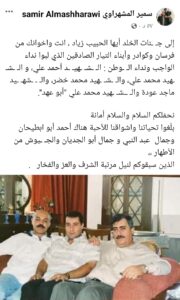 وقال المشهراوي في تدوينة له عبر حسابه ” فيسبوك” : “إلى جنات الخلد أيها الحبيب زياد ، انت واخوانك من فرسان وكوادر وأبناء التيار الصادقين الذي لبوا نداء الواجب ونداء الوطن : الشهيدأحمد علي، و الشهيد محمد علي، والشهيد محمد خضر، والشهيد ماجد عودة والشهيد محمد علي “أبو عهد”.
