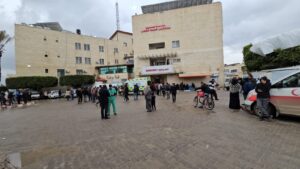 الهلال الأحمر الاماراتي واللجنة الوطنية للشراكة والتنمية يوزعان سلات في مستشفى شهداء الأقصى في دير البلح