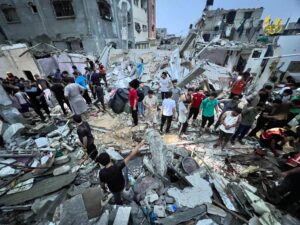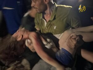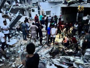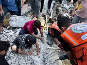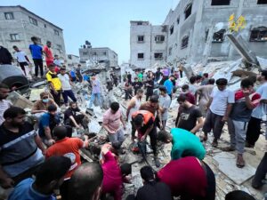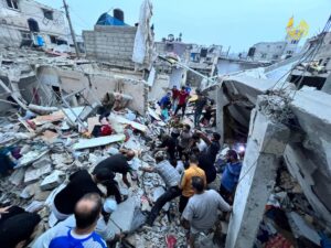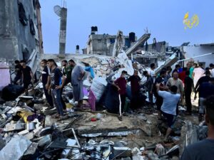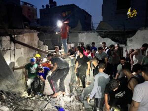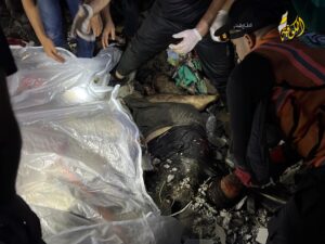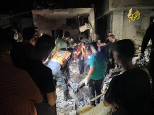 انتشال أكثر من 10 شهداء واصابات من تحت ركام منزل يعود لعائلة طموس بعد قصفه من قبل طائرات الاحتلال في شارع المجادلة غرب مدينة خانيونس.