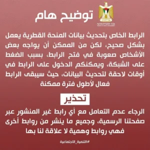 أصدرت وزارة التنمية الاجتماعية بغزة، اليوم السبت، توضيحاً بشأن رابط تحديث بيانات المنحة القطرية للأسر المتعففة في القطاع.