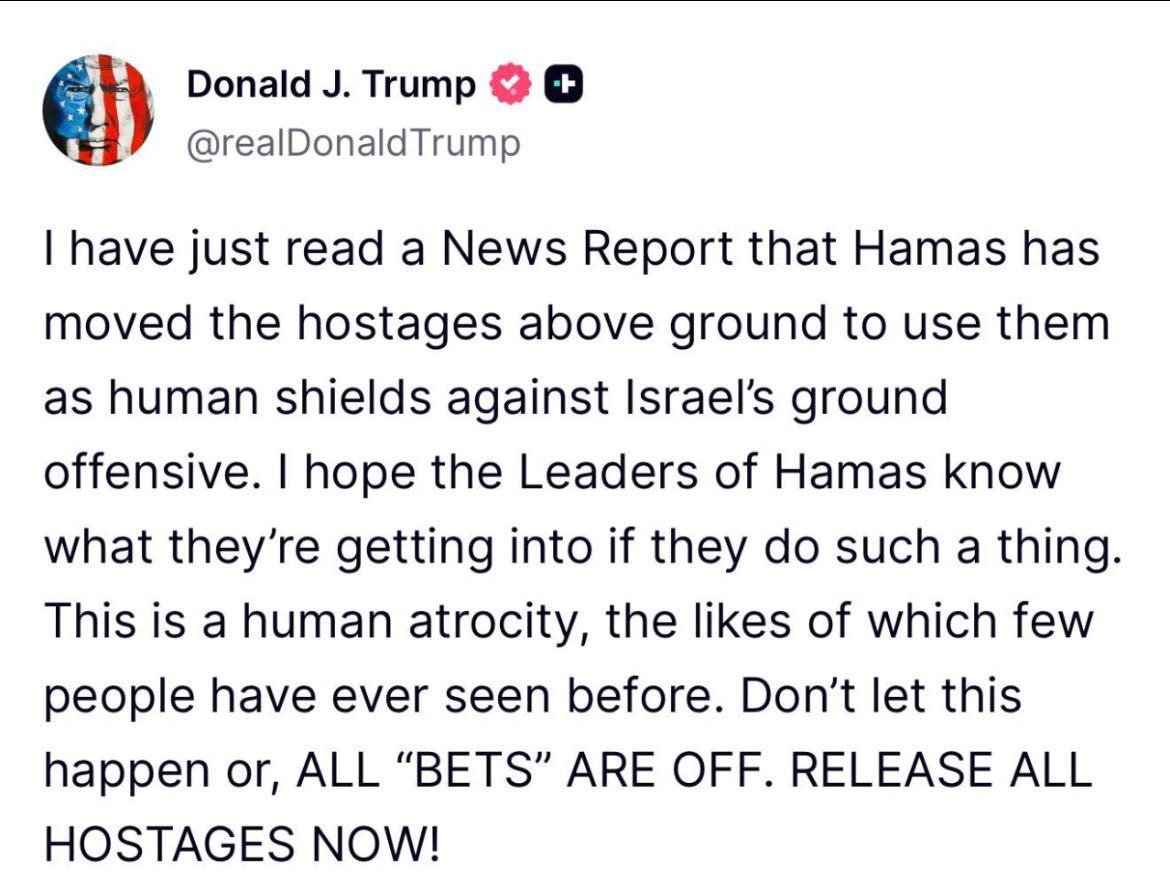 ووصف ترامب الخطوة المحتملة بأنها “رعب إنساني لم يشهده العالم من قبل”، مضيفاً:”لا تدعوا هذا يحدث، وإلا فإن العواقب ستكون وخيمة. أطلقوا سراح جميع الرهائن الآن”.
