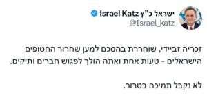 نشر وزير الأمن الإسرائيلي يسرائيل كاتس مساء السبت، تغريدة مثيرة للجدل بعد إطلاق سراح زكريا الزبيدي، أحد الأسرى الفلسطينيين البارزين، في إطار اتفاق تبادل الأسرى الذي شمل إطلاق سراح محتجزين إسرائيليين.