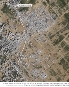 كشف مركز الأمم المتحدة للأقمار الصناعية، أن 90% من المباني في المنطقة العازلة دمرت أو تضررت، وهي آلاف المباني التي تم تدميرها كجزء من المشروع الإسرائيلي، وهو الأمر الذي قال عنه المجتمع الدولي إنه يمكن اعتباره «جريمة حرب».