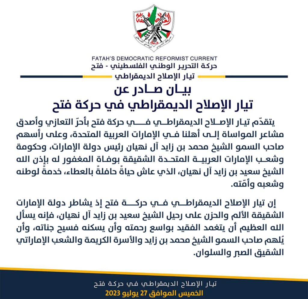 تَقدم تيار الإصلاح الديمقراطي، في حركة فتح، بأحرّ التعازي وأصدق مشاعر المواساة إلى أهلنا في الإمارات العربية المتحدة، وعلى رأسهم صاحب السمو الشيخ محمد بن زايد آل نهيان رئيس دولة الإمارات، وحكومة وشعب الإمارات العربية المتحدة الشقيقة بوفاة المغفور له بإذن الله الشيخ سعيد بن زايد آل نهيان، الذي عاش حياةً حافلةً بالعطاء، خدمةً لوطنه وشعبه وأمّته.