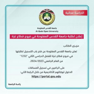 جامعة القدس المفتوحة تعلن فتح باب التسجيل لأبناء قطاع غزة لاستكمال مسيرتهم التعليمية