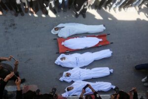 تشييع جثامين خمسة شهداء، بينهم ثلاثة أطفال، بعد ارتقائهم بقصف الاحتلال لمنطقة مشروع بيت لاهيا، شمال قطاع غزة الليلة الماضية.