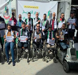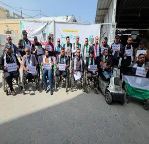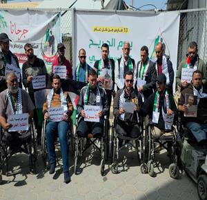 جرحى ومصابون فقدوا أطرافهم خلال الحرب يشاركون في وقفة احتجاجية في ساحة مستشفى شهداء الأقصى في دير البلح للمطالبة بحقهم في تلقي العلاج وللتأكيد على معاناتهم، تزامناً مع يوم الجريح الفلسطيني