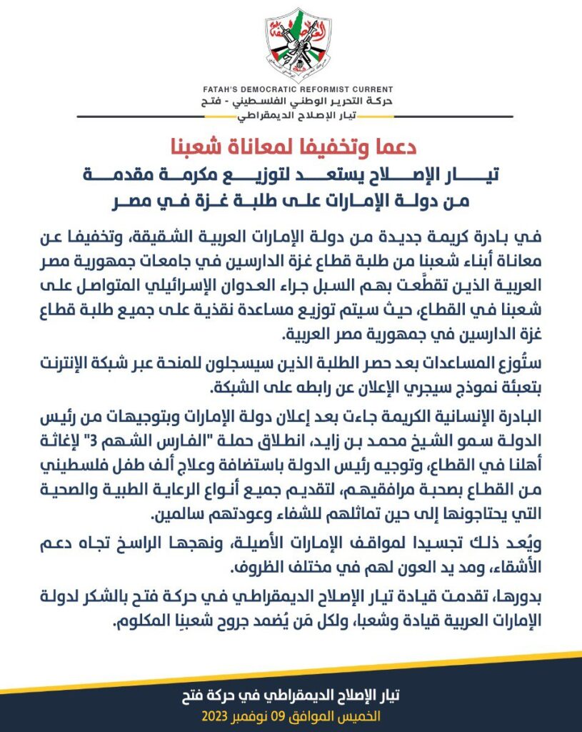 بدورها، تقدمت قيادة تيار الإصلاح الديمقراطي في حركة فتح بالشكر لدولة الإمارات العربية قيادة وشعبا، ولكل مَن يُضمد جروح شعبنِا المكلوم.