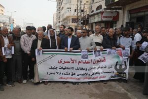وقفة حاشدة عند مدخل مخيم النصيرات رفضاً لقانون الإعدام بحق الأسرى.
