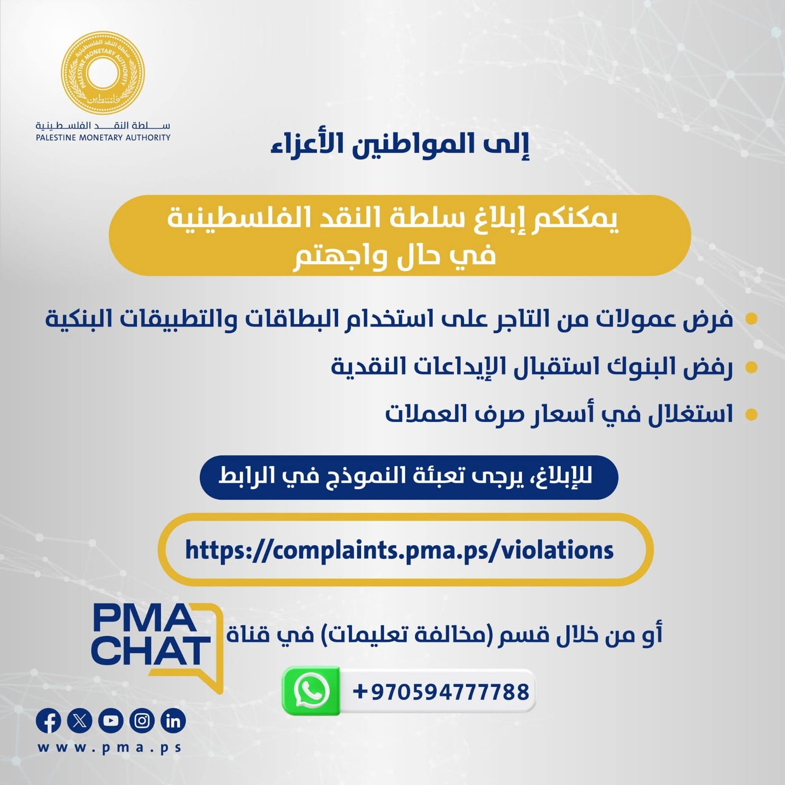 https://complaints.pma.ps/violations، أو من خلال رقم “واتساب” المخصص: +970594777788، للإبلاغ عن أي من المخالفات التالية: