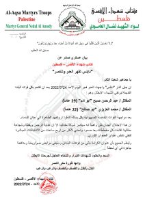 نعت كتائب شهداء الأقصى شهداء نابلس وقالت في بيان لها:” ان جبل النار “نابلس” واجهت العدو فجر اليوم الاحد 24/7/2022 بعد ان اقتحم بكل قواته البلدة القديمة ليرتقي الشهداء الابطال وهم :الشهيد عبد الرحمن صبح “ابو ادم” (29 عاماً)، والشهيد محمد العزيزي “ابو صالح” (22 عاماً)بعد مواجهة القوات الخاصة الصهيونية بكل بسالة لتعلوا ارواحهم الطاهرة الي عنان السماء.