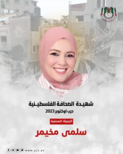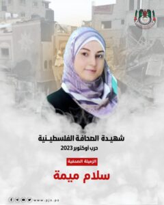 استشهدت الصحفية في إذاعة صوت القدس ورئيس لجنة الصحفيات في التجمع الإعلامي بغزة الصحفية سلام ميمة، نتيجة القصف الاسرائيلي على منطقة بئر النعجة في مخيم جباليا شمال قطاع غزة بتاريخ 10/10/2023 ، واستشهد معها زوجها محمد عبد الناصر المصري وبنائهم الثلاث هادي وعلي وشام.