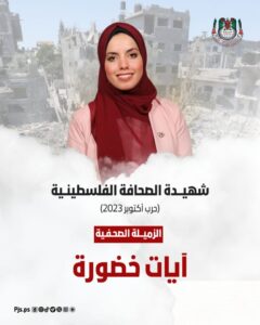 استشهدت الصحفية الحرة، ومقدمة البودكاست آيات خضورة 27 عاما ، في 20/11/2023 مع عدد من أفراد عائلتها، في غارة جوية إسرائيلية على منزلها في بيت لاهيا شمال غزة. حاصلة على شهادة البكالوريوس في الإعلام الرقمي من جامعة القدس المفتوحة، حاصلة أيضا على شهادة من حاضنة الأعمال (BTI) في مجال التحرير الصوتي ،عملت محررة في معهد دوز، وأنشأت العديد من المدونات ، استشهدت رفقة جدتها وثلاثة من إخوتها .