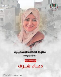 استشهدت الصحفية في اذاعة الأقصى دعاء شرف في 26/10/2023 مع ابنها عبيدة عام ونصف في غارة جوية إسرائيلية على منزلها في اليرموك بمدينة غزة. تخرجت في الجامعة الإسلامية بغزة وهي معدة ومقدمة البرنامج الاجتماعي «مساء ملون» والبرنامج الاخباري «هذا المساء» عبر إذاعة صوت الأقصى ،وهي متزوجة من الصحفي محمود هنية الذي يعمل في جريدة الرسالة.