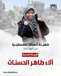 استشهدت الصحفية آلاء طاهر الحسنات 32 عاما إثر قصف قوات جيش الاحتلال الإسرائيلي لمنزل عائلتها في حي الدرج بقطاع غزة بتاريخ ، و;انت تعمل في «ألترا فلسطين»، كما اعتادت على نشر سلسلة من الحلقات بعنوان «رن الجرس» ضمن عملها في شبكة «الماجدات» الإعلامية قبل أن تستشهد رفقة شقيقتها الشاعرة جنين طاهر الحسنات، وعدد كبير من أفراد عائلتهما.