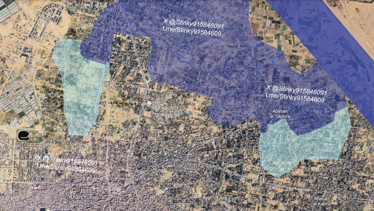 تشير الصور إلى تقدم القوات الإسرائيلية عبر طريق صلاح الدين ومنطقة قيزان النجار، مع فرض السيطرة على كافة الأحياء الواقعة جنوب مدينة خانيونس.