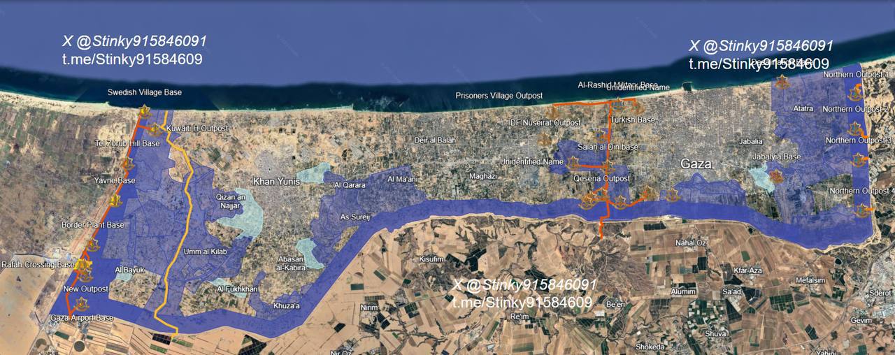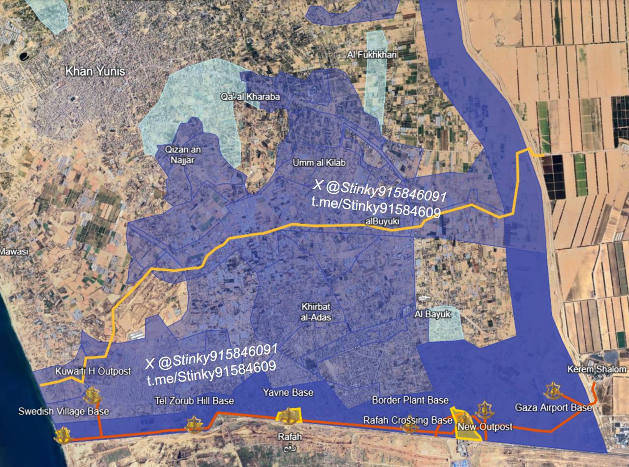 تشير الصور إلى تقدم القوات الإسرائيلية عبر طريق صلاح الدين ومنطقة قيزان النجار، مع فرض السيطرة على كافة الأحياء الواقعة جنوب مدينة خانيونس.