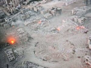 صور | الاحتلال يدمر مربعا سكنيا كاملا بمحيط مسجد فلسطين في حي الرمال بمدينة غزة.