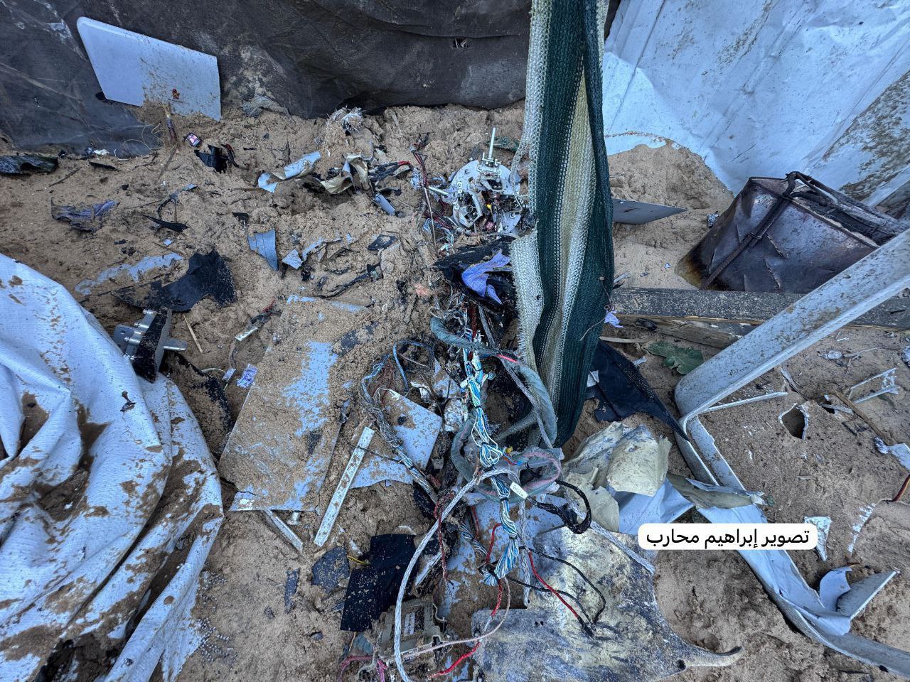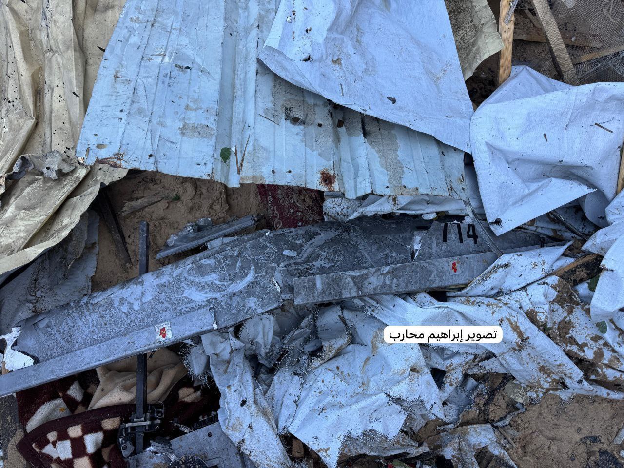 صور| المُسيَّرة الانتحارية الإسرائيلية التي ارتكبت مجزرة بحق عائلة شعبان، والتي راح ضحيتها 10 شهداء، بعد استهداف خيمتهم في منطقة العطار غرب مدينة خان يونس.