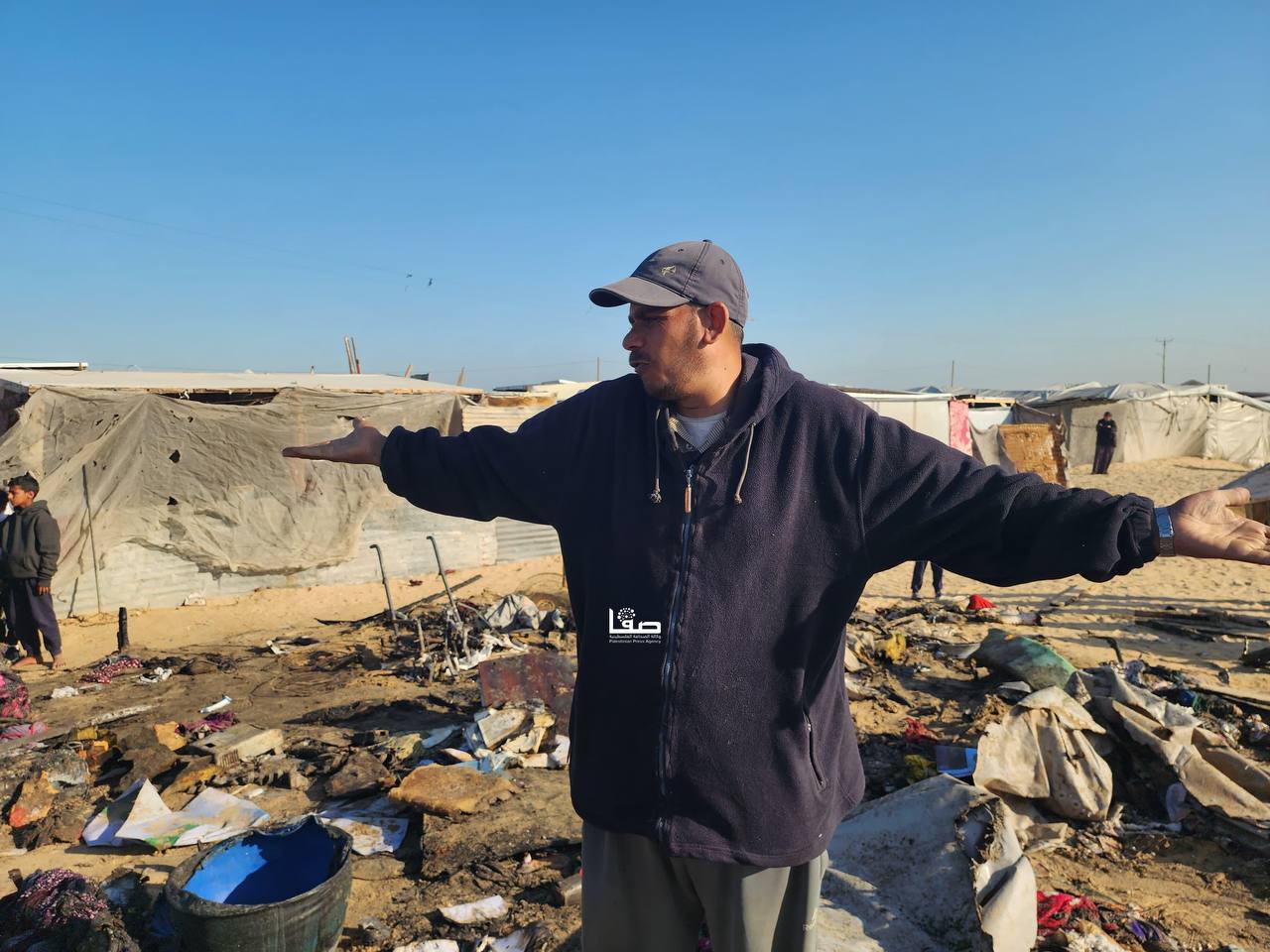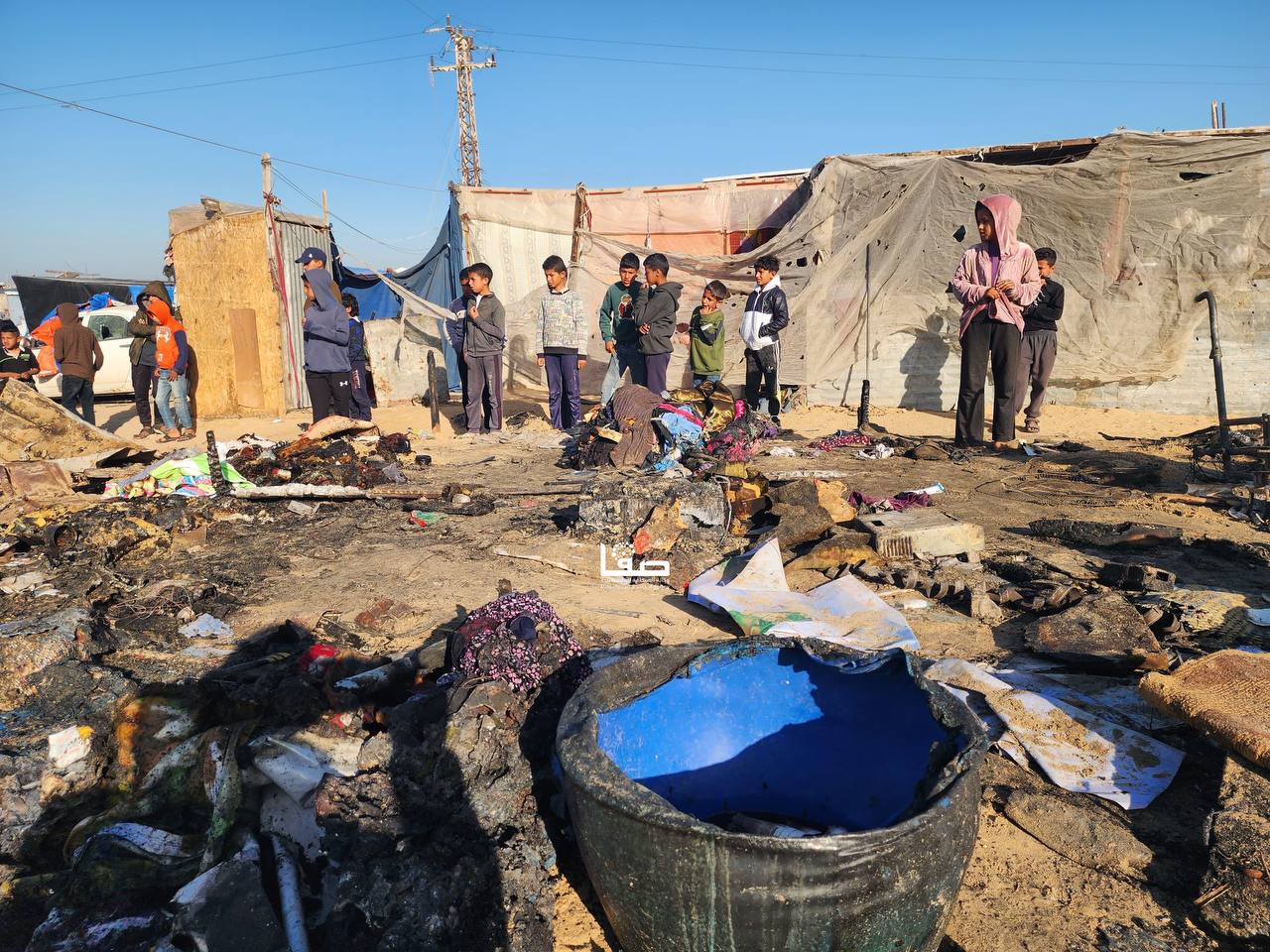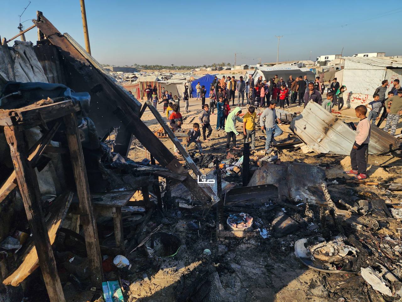 صور ||  جانب من حرق وتدمير خيام النازحين إثر القصف الإسرائيلي على مواصي خانيونس جنوبي قطاع غزة مما أدى إلى استشهاد وإصابة عدد من المواطنين.