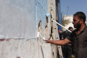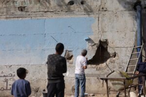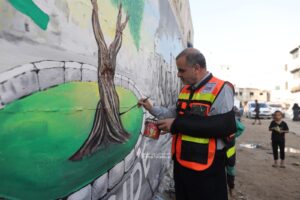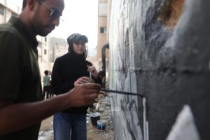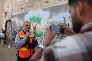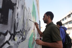 بالصور نشطاء يرسمون جدارية ضخمة تُندد بالإبادة البيئية بخانيونس