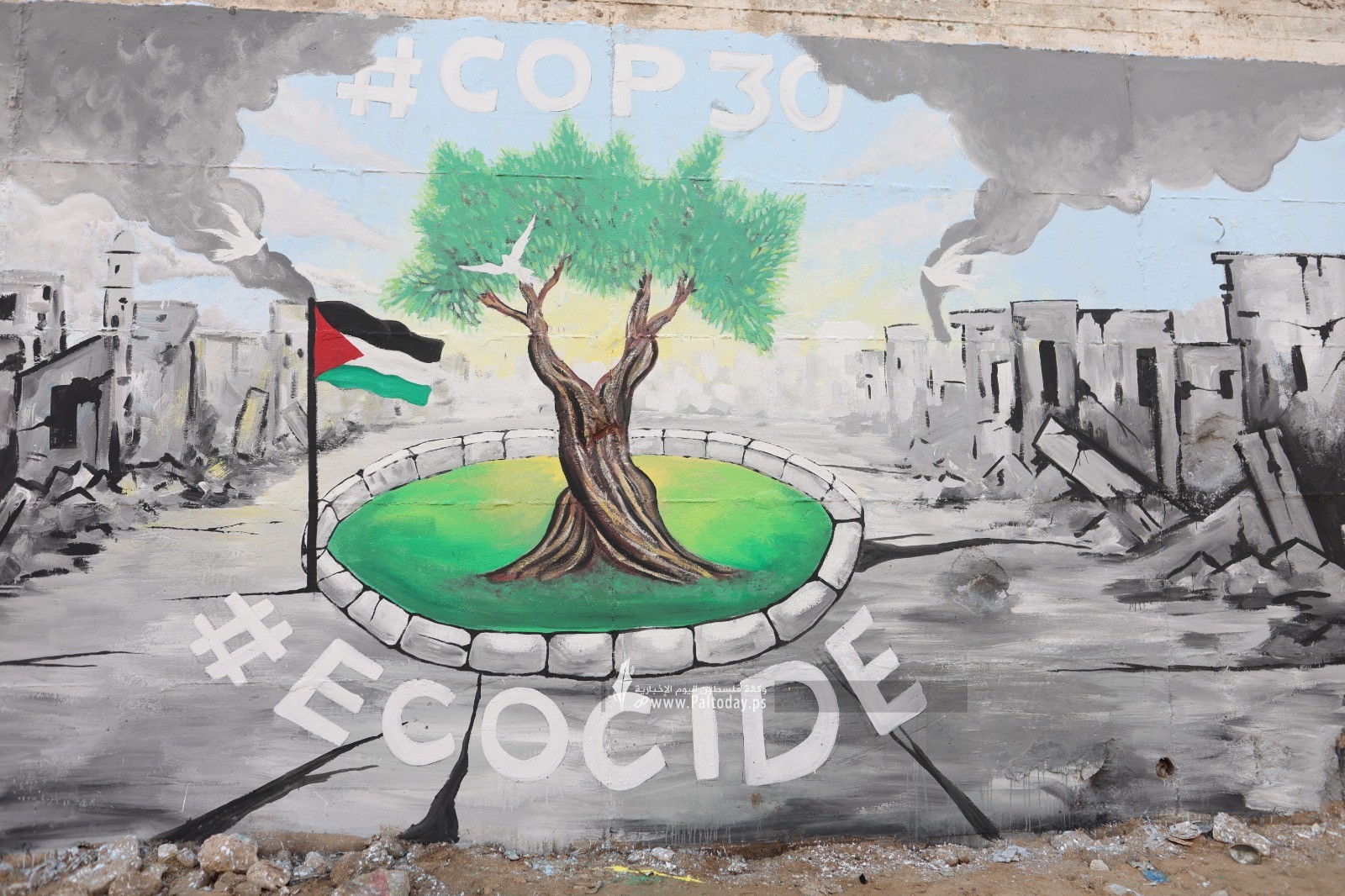صور|| نشطاء يرسمون جدارية ضخمة تُندد بالإبادة البيئية بخانيونس