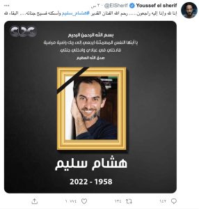 وتفاعل عشرات الفنانين ونشطاء مواقع التواصل الاجتماعي، مع خبر وفاة الفنان المحبوب والقدير هشام سليم..