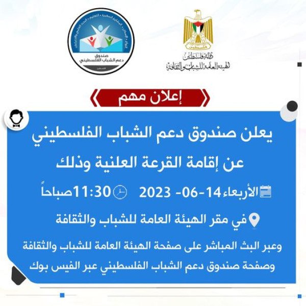 وقال صندوق دعم الشباب إن موعد إقامة القرعة الإعلانية غدًا الأربعاء في مقر الهيئة العامة للشباب والثقافة وعبر البث المباشر على صفحة الهيئة والصندوق.