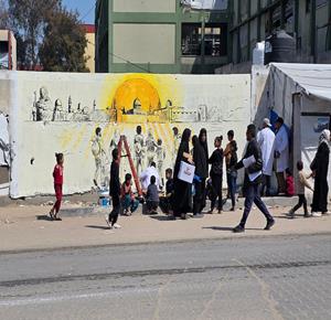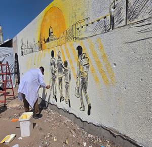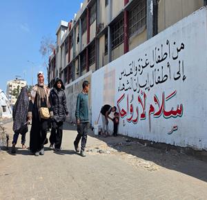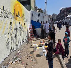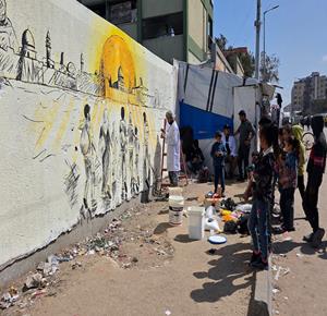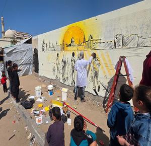 غزة – فنانون يرسمون جداريات وكتابات خطية على جدران مدرسة حُوّلت إلى مأوى للنازحين في مدينة غزة