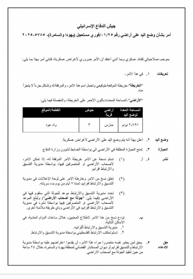 وأفاد رئيس مجلس قروي حارس الشيخ عمر سمارة، بأن ما يُسمى قائد جيش الاحتلال أصدر أمرا عسكريا يقضي بالاستيلاء على دونمين و791 مترا من أراضي حارس، ضمن حوض رقم (3) في منطقة “واد عود”.