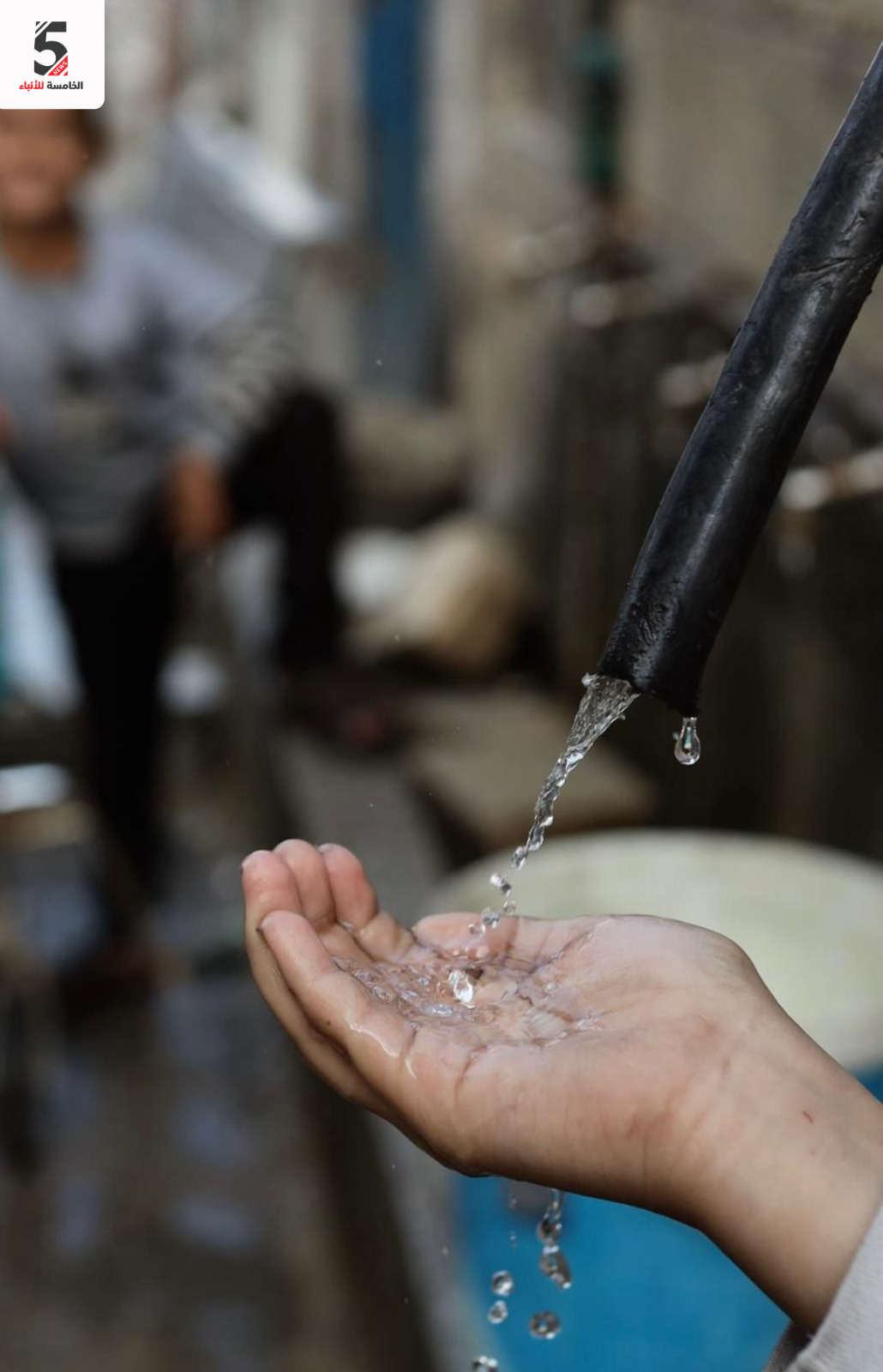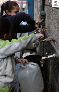 قطرات ماء شحيحة… ووجوه صغيرة تنتظر الحياة.. أطفال يقفون أمام صنبور بالكاد يقطر، في مشهد يلخص جزءًا من معاناة النازحين مع فقدان المياه الصالحة للشرب